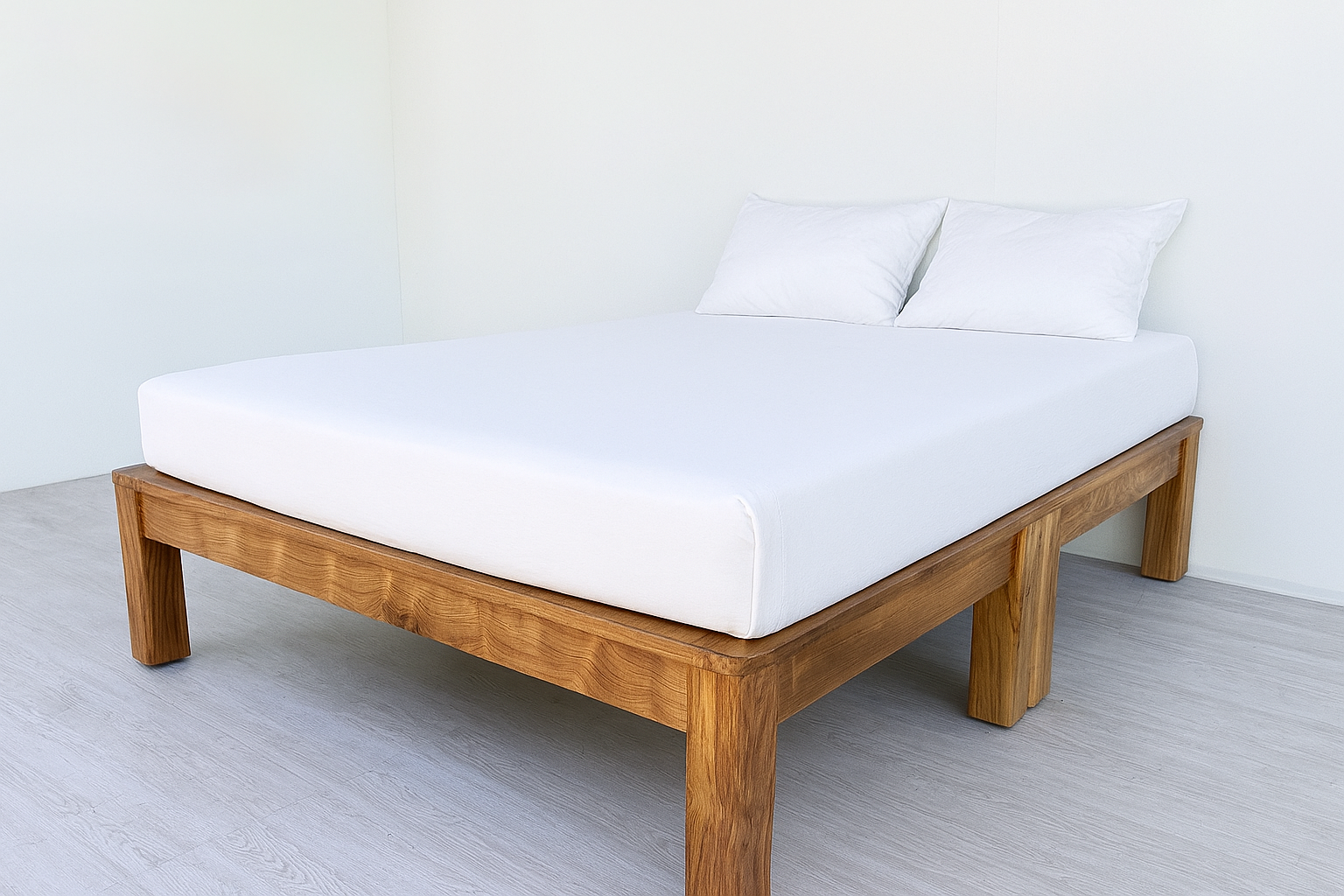 沒有床頭,反而更自由。 你可以靠牆、靠窗、靠喜歡的位置—— 空間小,也能睡得大方 床底高 41 公分,方便清潔收納,清掃機器人自由進出 分離式雙底座設計,全滿底支撐,完整保護獨立筒床墊壽命 10 隻實木腳撐住全床,沉穩不晃,重力平均不塌陷 材質:柚木 尺寸:五尺 W153. D194. H41.